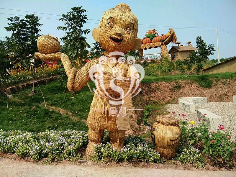 現在的精致稻草人藝術通常是由專業美術老師的造型放樣,然后由焊工師傅焊接出立體造型造型,然后以稻草或者稻草繩為材料編捆制作而成。
