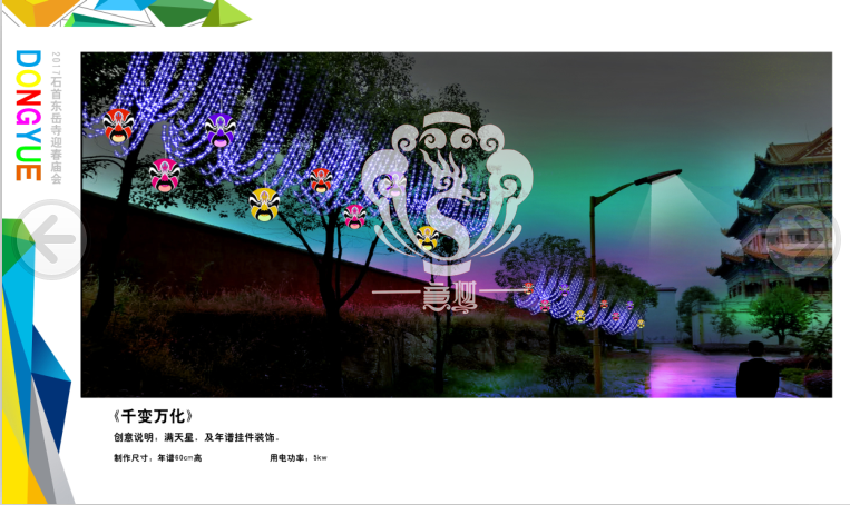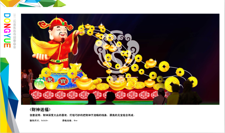 滿懷喜悅,深感榮幸。自貢市意樹文化傳播有限公司通過對湖北荊州石首東岳寺的實地考察,和我們的不懈努力,《湖北荊州石首東岳寺首屆迎春燈會方案》設計工作圓滿完成。我們結合東岳寺特色及氛圍營造亮化區域地形地貌,緊抓“歡慶佳節”的設計主題,把迎春燈會精心打造成2017年迎春的亮點,獻上盛大的視覺歡樂盛宴!
