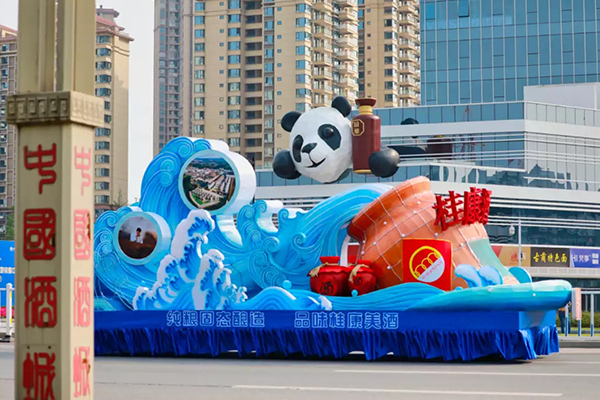 4月12日,在四川瀘州西南商貿城五區門口,五輛“酒”主題花車??吭诼愤?,酒壇、酒瓶、酒葫蘆、釀酒高粱等與酒相關的元素,使得花車造型精美新穎、極具視覺沖擊力,可謂一車一故事,一車一風景。