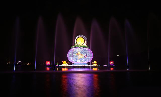 "水月鳳凰"觀賞臺附近湖面,一組以圓月為設計元素,繽紛色彩搭配的彩燈展現美態。在燈光的作用下,彩燈投影出戀人的剪影,一個個相依的身影,唯美浪漫。