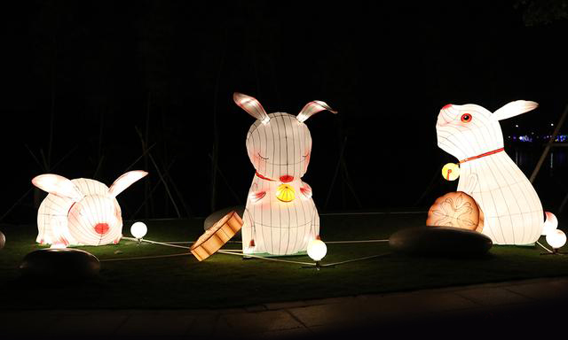 萌萌噠玉兔草地上"玩耍"。一組以中秋玉兔作為設計元素的彩燈,與中秋月餅相結合,在農歷八月的晚上,仿似給人間帶來節日的祝福。